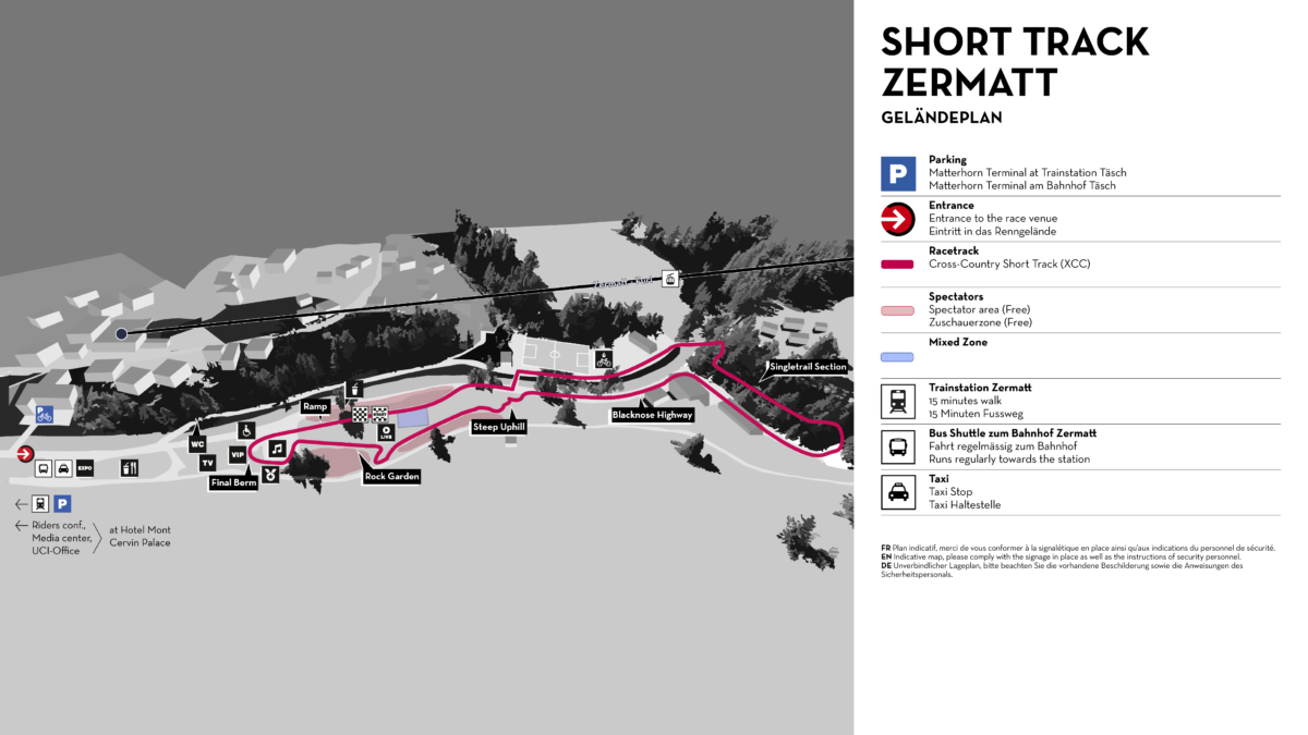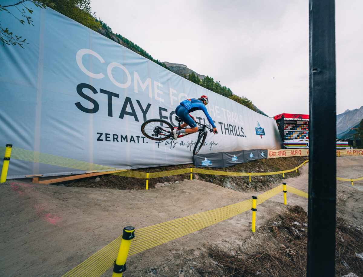 Beim Short Track (XCC) in Zermatt war Vast Trails für den Bau und Rückbau des temporären Rockgardens sowie für zwei zusätzliche Trail Features – einen Step Down Jump und eine grosse Anliegerkurve – verantwortlich. Die Herausforderung: Mit relativ wenig baulichem Aufwand sollte auf dem sonst eher schnellen und monotonen 1.2 km langen Rundkurs ein technisches, aber sicheres Hindernis entstehen. Der Rockgarden brachte, perfekt abgestimmt auf Cross Country-Bikes, die notwendige Würze in das Rennen. Mit reduziertem Federweg und nur leicht profilierten Reifen war Präzision gefragt – und das sorgte für Nervenkitzel. Zwei parallele Linien ermöglichten spannende Überholmanöver und dramatische Schlusssprints. MTB-Legende und SRF-Experte Thomas Frischknecht kommentierte begeistert: „Die beiden Linien sind sehr gut gebaut, beide sind genau gleich schnell. Wer mehr riskiert, ist somit schneller unten.“