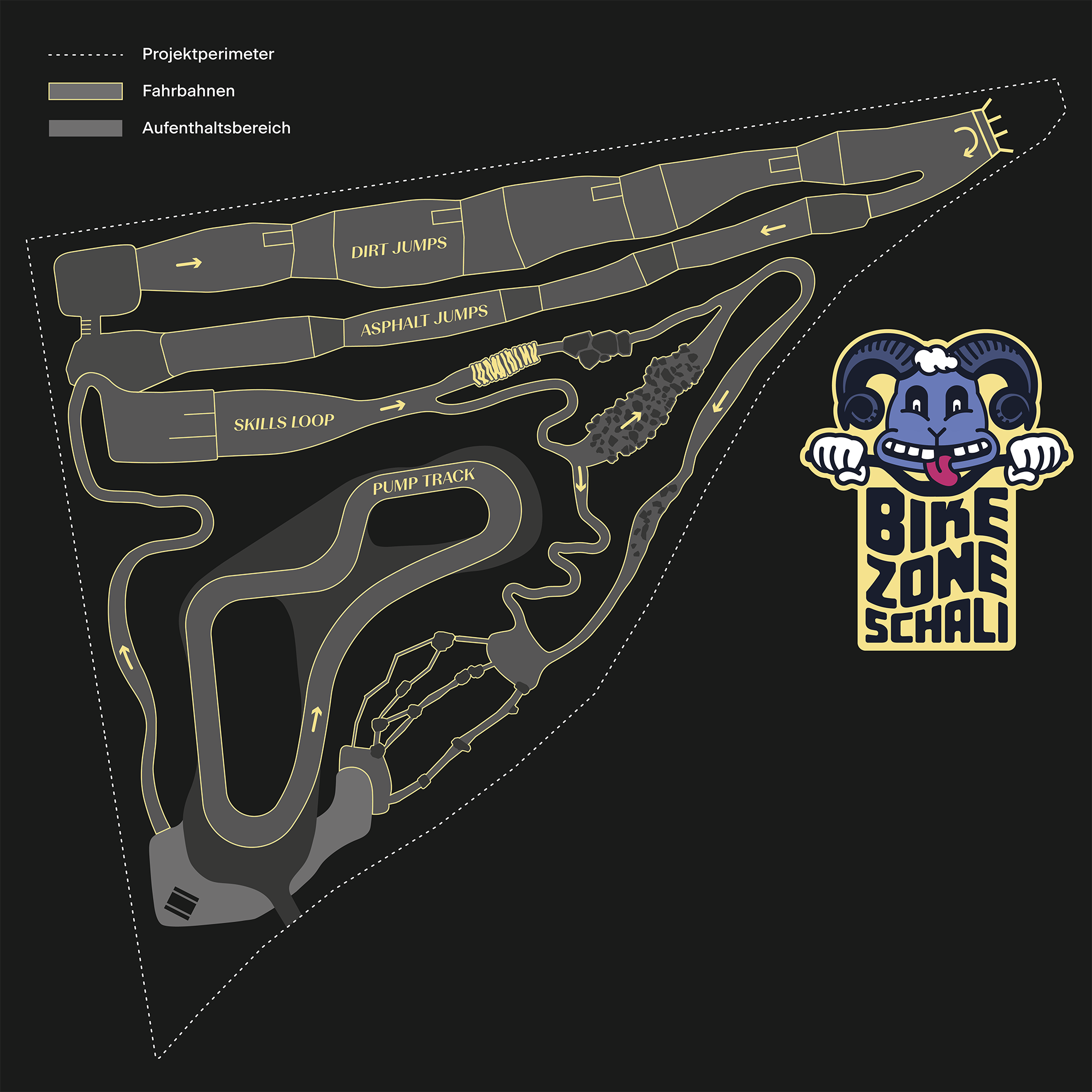 Das Konzept der Bikezone Schali wurde Hand in Hand mit dem Auftraggeber Bikeclub Mattertal entwickelt. Von grosser Bedeutung ist ein stufengerechtes und aufeinander aufbauendes Set Up zur Aneignung grundlegender Mountainbike-Techniken wie Hindernisse überfahren, Bremsen, Navigieren, Geschwindigkeit einschätzen, Gleichgewicht halten, Pumpen und Springen. Die drei Zonen Skills, Pump und Jump sind aus Sicherheitsgründen als in sich geschlossene Runden konzipiert und kreuzen sich daher nie.